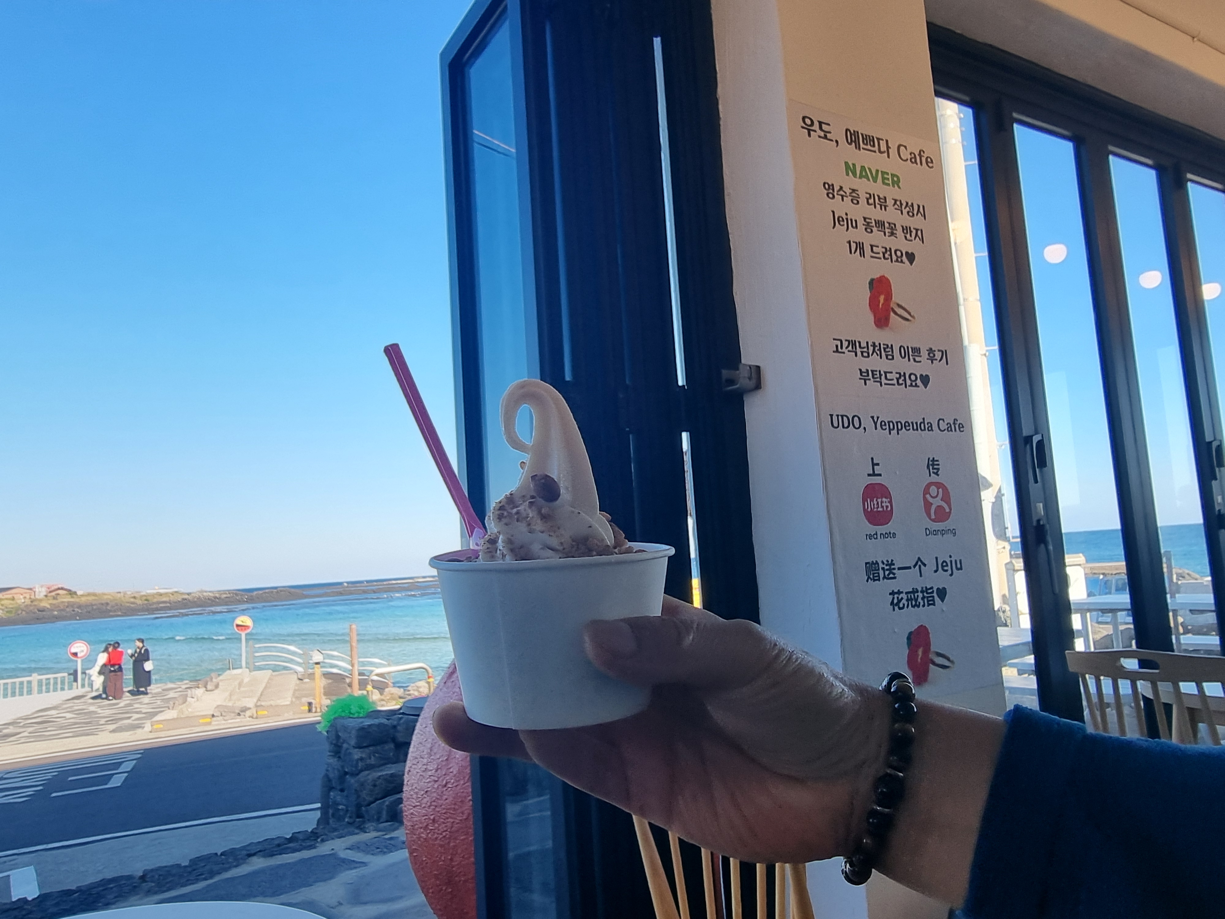 30분 정도 차를 달려 우도로 가는 배 선착장에 도착했다. 배는 30분 간격으로 있었다. 배를 타니 의자 대신 따뜻한 온돌방으로 되어 있어 편안하게 앉거나 누워서 우도까지 갈 수 있었다. 15분 정도 걸려 우도에 도착했다. 우도에서 자전거 일주를 했다. 전기자전거로. 우도 한바퀴 돌았다. 한바퀴 도는데 가다 쉬다 하니 2시간 넘게 걸렸다. 전기자전거지만 오르막도 있어 다리 아프게 저었던 거 같다.
