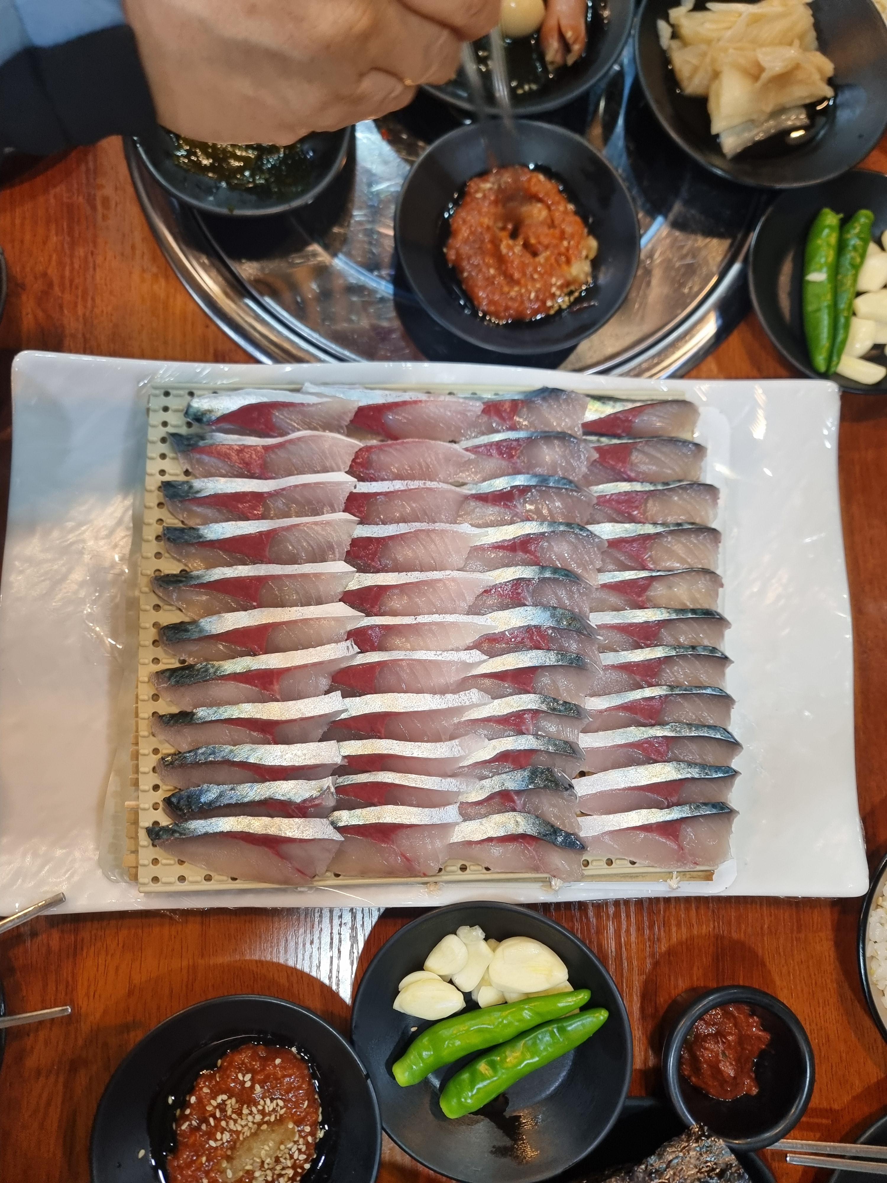 저녁을 먹으러 모슬포항으로 갔다. 부산의 기장해변처럼 횟집들이 늘어서 있는데 그 중 '미영이네' 집만 웨이팅이 있었다. 30분쯤 대기했다가 좌석을 배정받았다. 난생처음 고등어회랑 고등어탕을 먹었는데 맛있었다. 고등어회는 생선 비린내가 전혀 나지 않고 고소하니 맛이 좋았다. 점심에 이어 저녁까지 푸짐하게 먹었다. 맛집 찾아다니는 즐거움을 만끽한 하루다.