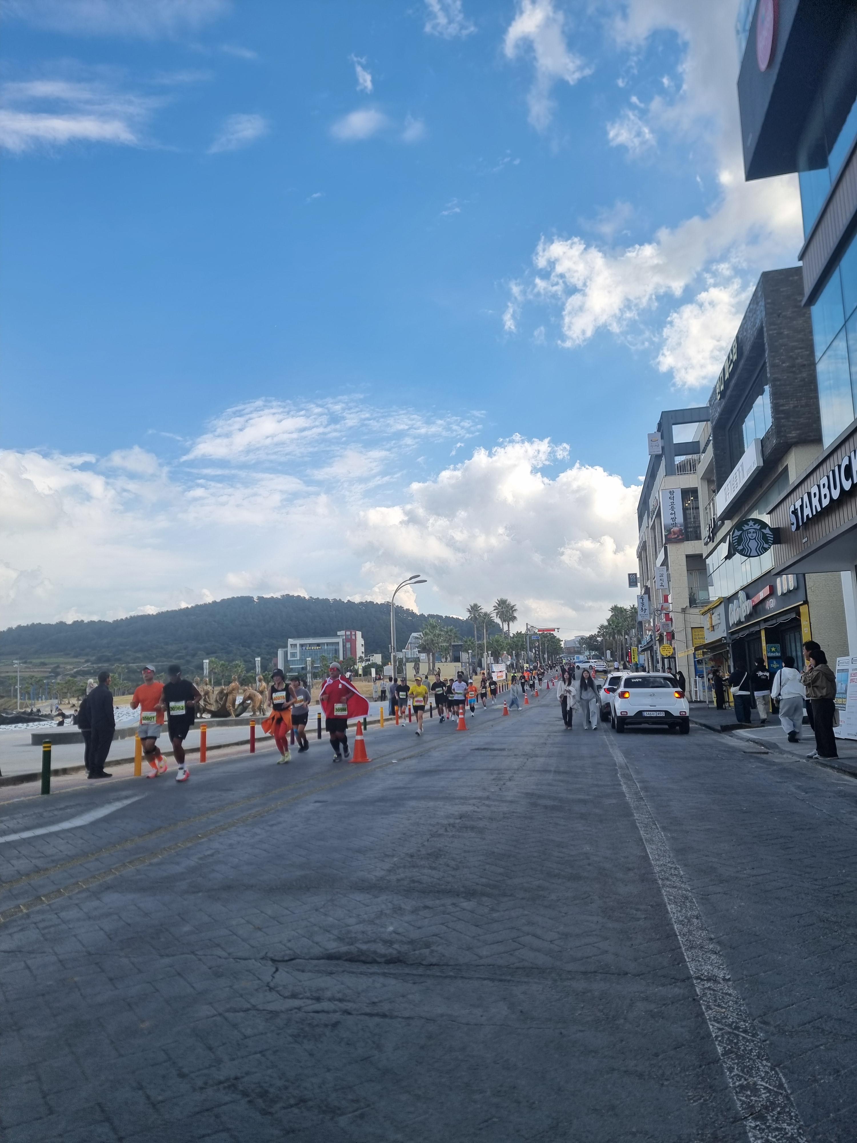 여행 마지막날이다. 12시 55분 비행기라 아침겸 점심을 먹고 공항으로 이동하면 될것 같았다. 월정리부터 해안도로를 봉쇄하고 있었다. 감귤 국제마라톤대회가 있단다. 함덕해수욕장에 도착하자 해안도로를 따라 마라톤 선수들이 달리고 있었다. 해안도로에 마라톤 선수들이 달리고 있었다. 화이팅을 외쳐주니 선수들이 엄지척해 주었다. 건강에너지가 넘지는 현장이었다 . 함덕해수욕장 해변가에 있는 '은하네해장국'집에서 소고기해장국을 아침 겸 점심으로 먹었다. 함덕에서 45분 정도 달려 렌트카 반납하고 공항에 도착, 3박 4일간의 제주도 일주여행의 끝. 즐겁고 행복한 여행이었다.