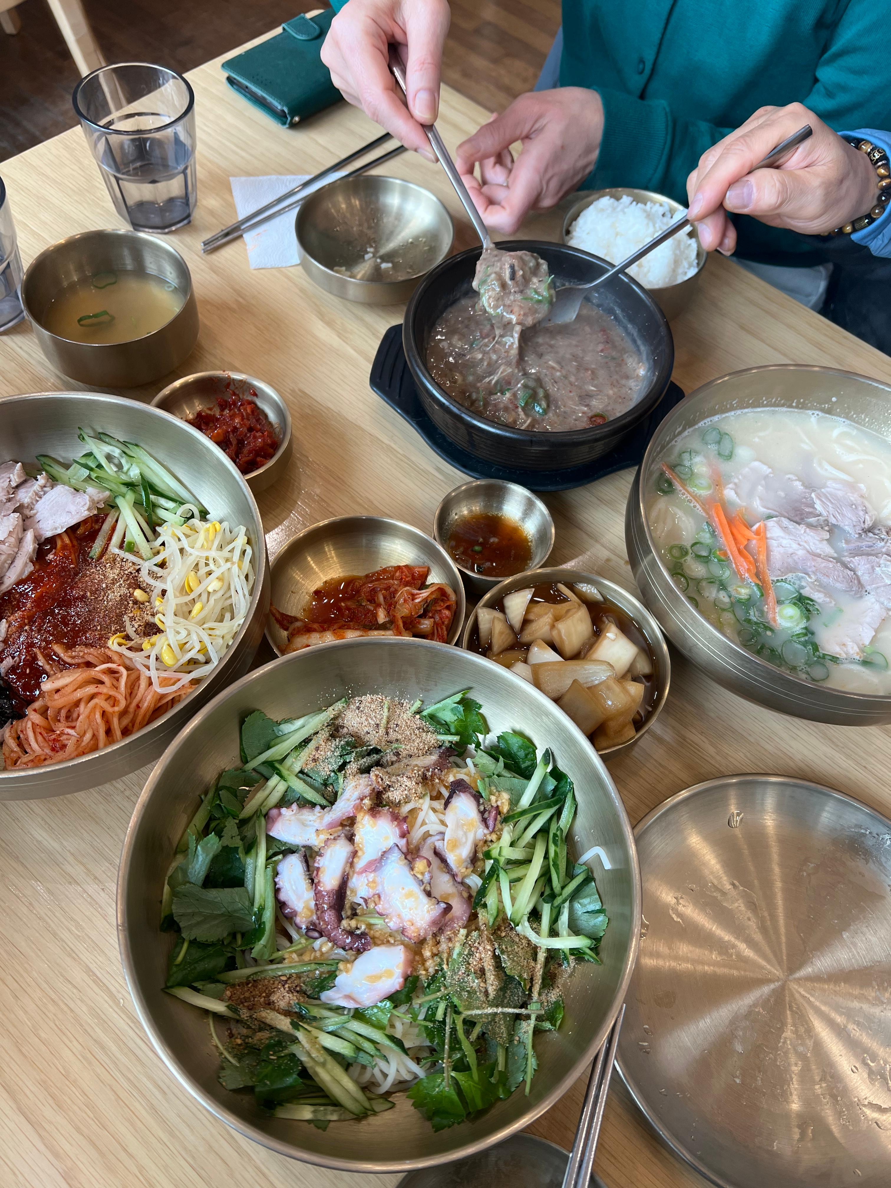 김포공항 9시25분 아시아나 제주행 비행기에 올랐다. 제주공항에서 제주시내로 이동 국수전문점 '섬누들'에서 고기국수와 고사리육계장, 문어들깨국수 등을 시켜 나눠 먹었다. 배가 고팠던 데다 음식도 맛있어서 정말 맛있게 먹었다. 정원이 넓고 음식과 식기가 정갈하니 정성스런 느낌이라 기분좋게 식사를 끝냈다.