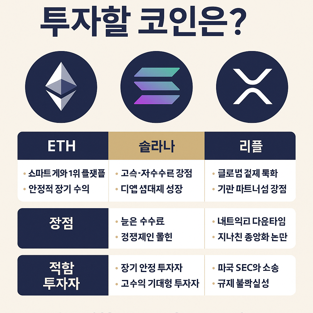 그렇다면 이더리움(Ethereum), 솔라나(Solana), 리플(XRP) 중 어떤 코인에 투자하는 것이 가장 현명할까요? 이 글에서는 세 코인을 기술 구조, 투자 수익성, 생태계 활용도, 리스크 요인 측면에서 비교하고, 투자 성향별로 어떤 코인을 선택해야 할지 제안드립니다.
